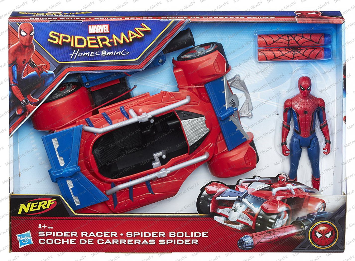Spider-Man gira per la città con il suo Spider Racer e sfida Vulture in un inseguimento ad alta velocità. Inclusa nella confezione una figures di Spider-Man alta oltre 15 cm e lo Spider Racer lancia proiettili per sconfiggere i cattivi. I bambini possono divertirsi mettendo in scena le epiche battaglie tra Spider-Man ed i suoi nemici storici: Venom, Goblin e blablabla.